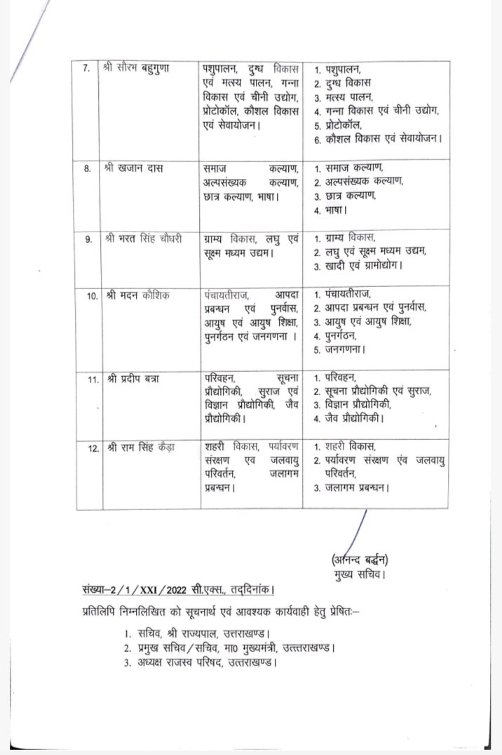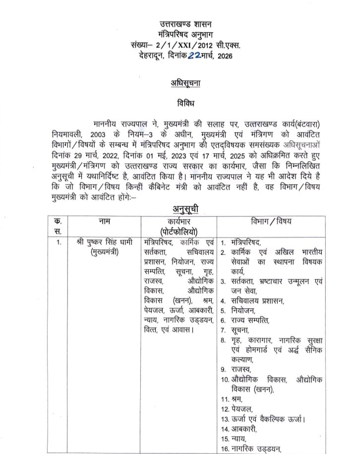 *धामी खुद देखेंगे सामान्य प्रशासन, गृह, कार्मिक, नियुक्ति एवं प्रशिक्षण सूचना एवं जनसंपर्क विभाग*
