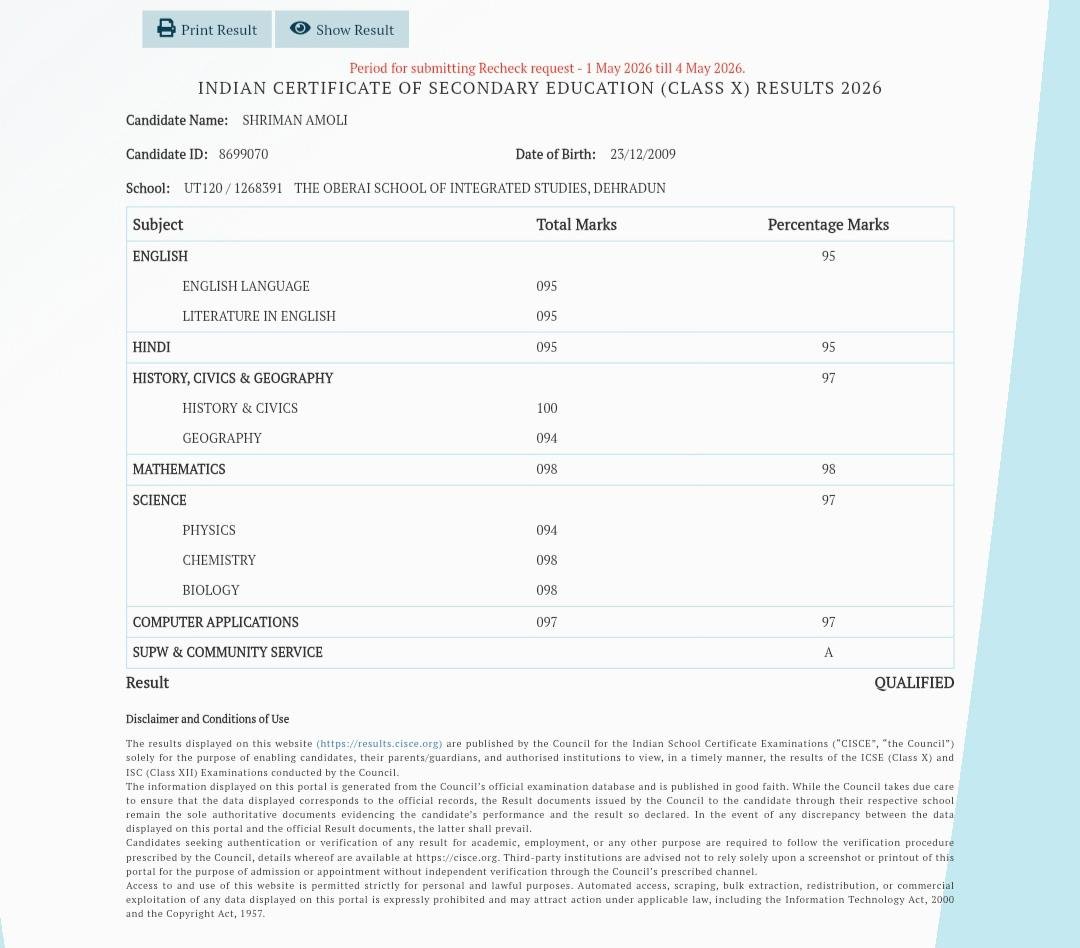 Oasis के छात्र श्रीमन अमोली ने दसवीं में हासिल किए 97 प्रतिशत